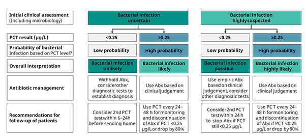 Um documento de consenso recente de Schuetz et al. apresenta recomendações para a gestão do uso de antibióticos nos pacientes nos Serviços de Urgência e nas UCI baseadas na gravidade clínica, na probabilidade de infeção bacteriana e nos níveis da PCT. Consultar as figuras 1 - 3 [1].